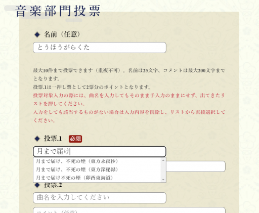 ※注意:投票入力対象の際には、項目名を入力してもそのまま手入力のままにせず、出てきたリストから項目を押してください。項目名をそのまま入力しただけだと、認識されず投票できないことがあります。