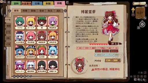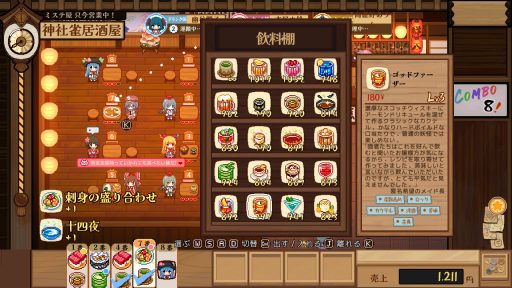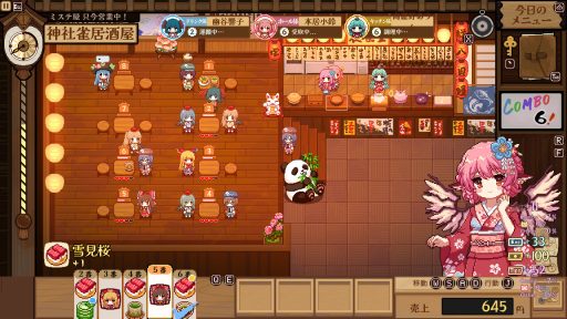 人間の里で出店した様子。人間は勿論、妖怪も居酒屋に来店! 料理や飲料の種類は多岐にわたります。注文に合った品を提供しましょう 特定のキャラはお手伝いを依頼可能!(賃金はしっかり発生します) 手持ちのレシピと仕入れ状況から本日のメニューを決定! 特定のお客さんを満足させるとスペルカードで援護をしてくれます! コツコツ稼いで少しずつお店を大きくしていきましょう!