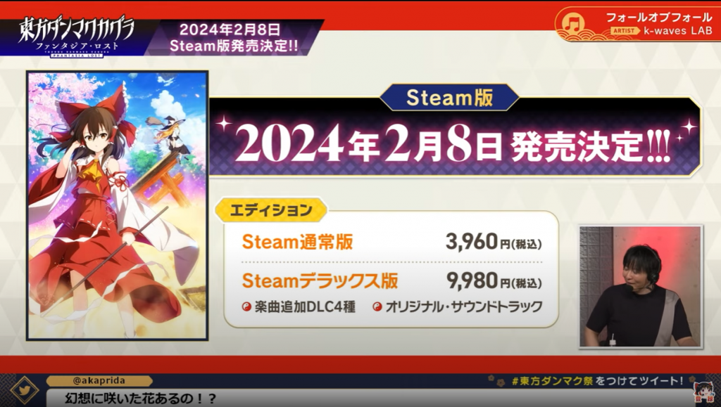— 東方ダンマクカグラ◆Steam版 2024年2月8日発売決定! (@danmakuJP) August 7, 2023