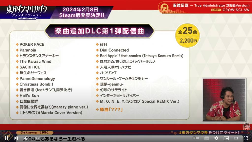 ゲーム本体には、上海アリス幻樂団による東方Project原曲7曲と、クラウドファンディングの返礼品として選ばれた希望楽曲7曲を含む、全68曲が収録されます。