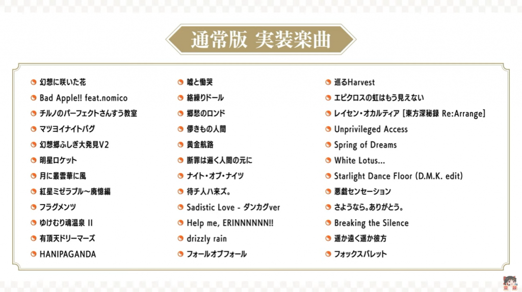 ゲーム本体には、上海アリス幻樂団による東方Project原曲7曲と、クラウドファンディングの返礼品として選ばれた希望楽曲7曲を含む、全68曲が収録されます。