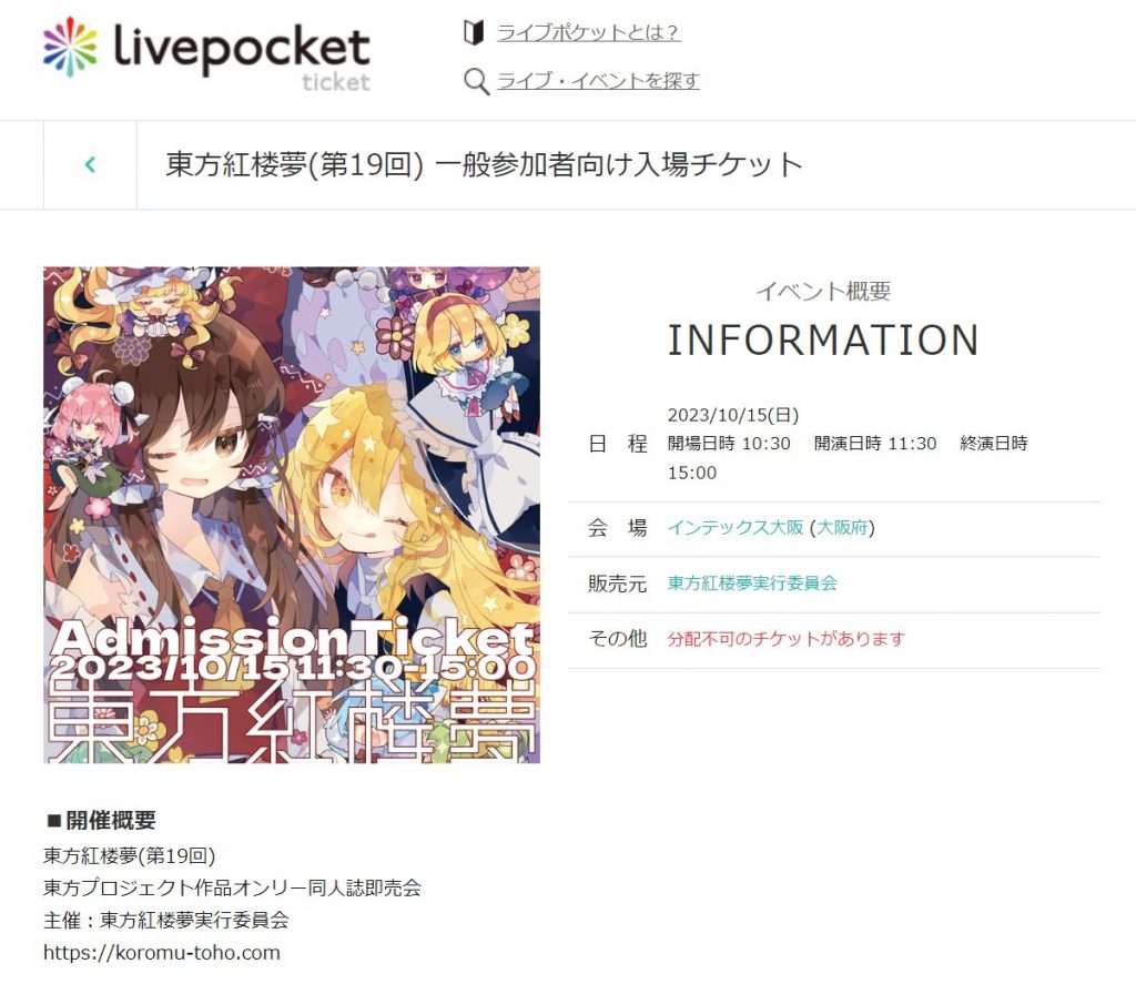 10月15日(日)にインテックス大阪で開催予定の東方Project作品オンリーイベント『第19回東方紅楼夢』の一般参加者向け入場チケットが販売開始されました。