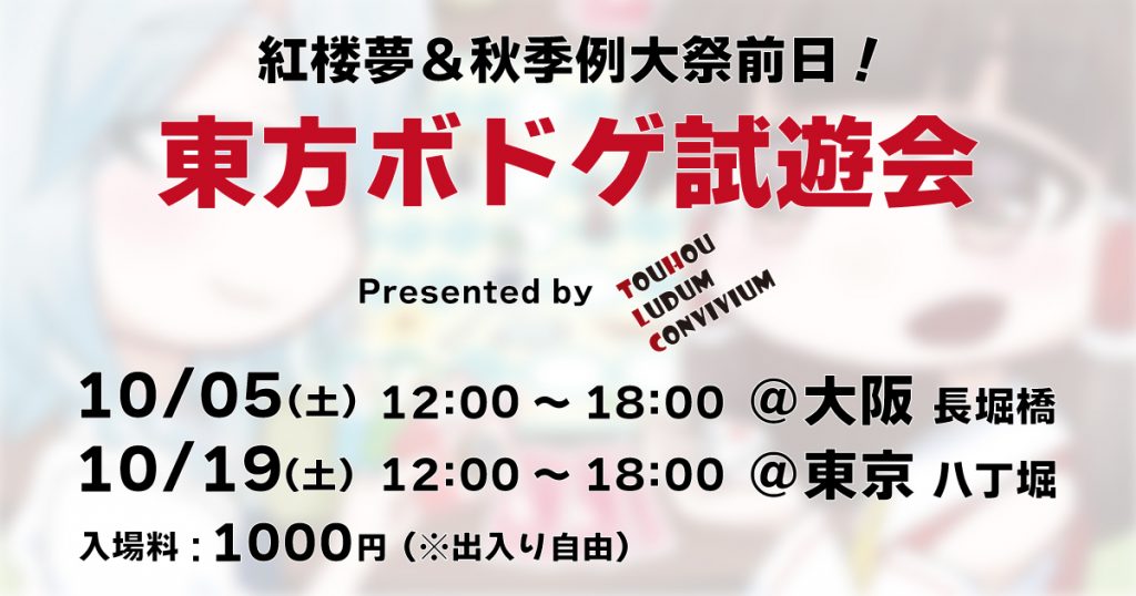 東方ボドゲ界初の「イベント前日ボドゲ試遊会」を紅楼夢前日の10月5日に大阪で、秋季例大祭前日の10月19日に東京で開催!