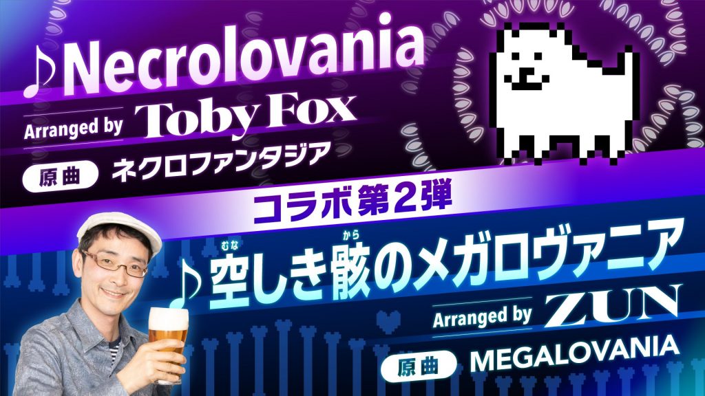今回のコラボでは、Toby Foxさん・ZUNさんそれぞれによるアレンジ楽曲を1曲ずつ、計2曲を制作。Toby Foxさんは「東方Project」より楽曲『ネクロファンタジア』をアレンジした、その名も『Necrolovania』を書き下ろし。対してZUNさんの楽曲は、『UNDERTALE』より楽曲『MEGALOVANIA』をアレンジした『空しき骸のメガロヴァニア』です。