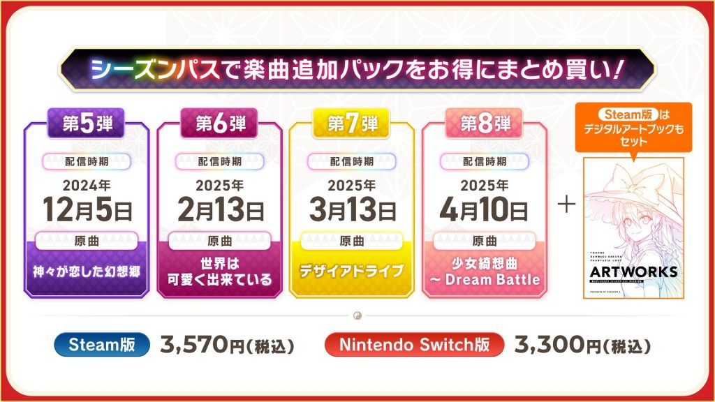これらの楽曲パックをお得にまとめ買いできるシーズンパスもSteam・Nintendo Switchで発売中!今後の配信を楽しみにお待ちください。