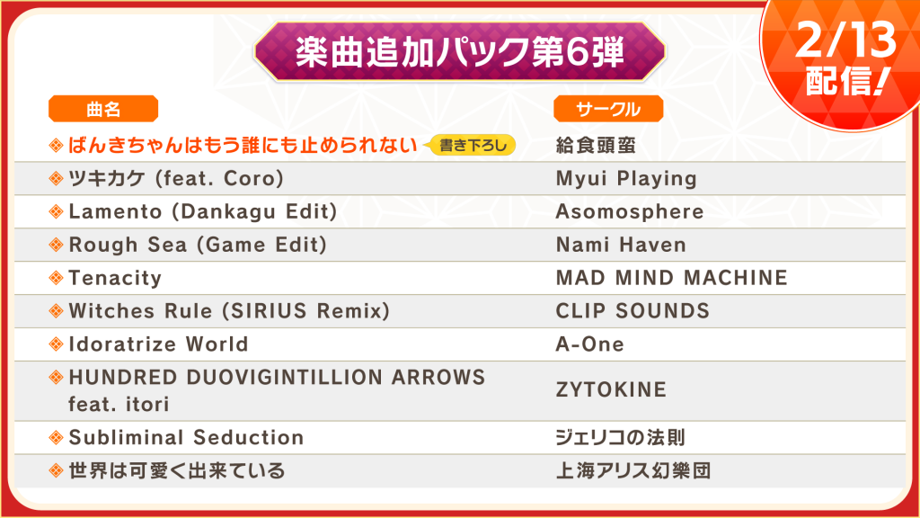 2月より毎月リリース予定の楽曲追加パック第6弾・第7弾・第8弾の収録楽曲・配信予定日も一挙公開。すべての楽曲追加パックで、東方Projectの原曲のほかに『ファンタジア・ロスト』書き下ろし
