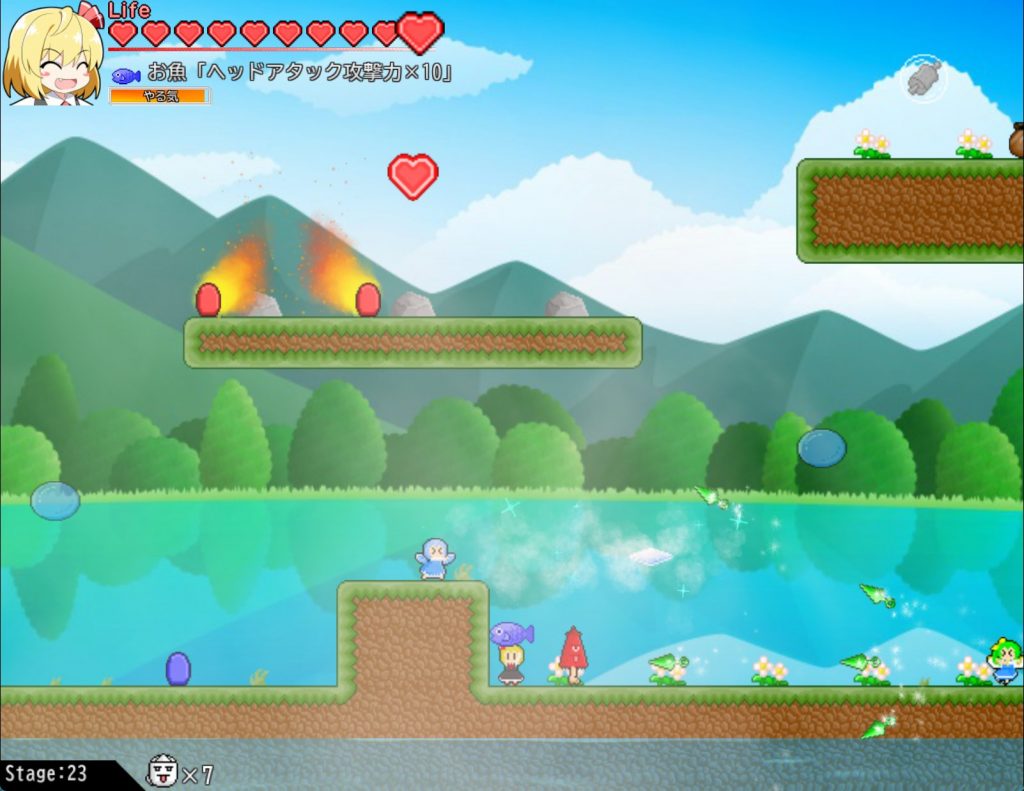 食料が底を尽きてお腹が空きすぎた為、弾幕が撃てなくなってしまったルーミアはその辺に落ちている箱や岩、魚などの武器を投げたり蹴ったり、投げた物に乗って移動したりと様々なアクションを駆使をして敵を倒して食料を調達していきます。