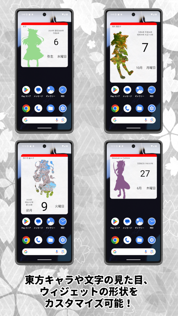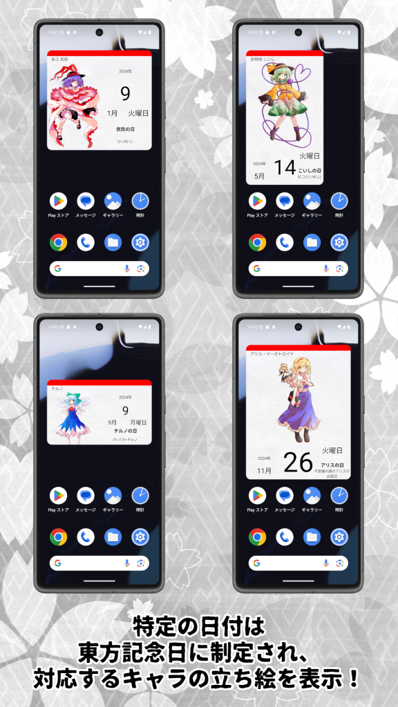 このアプリは東方Projectのキャラクターが毎日表示される、日めくりカレンダーのウィジェットです。