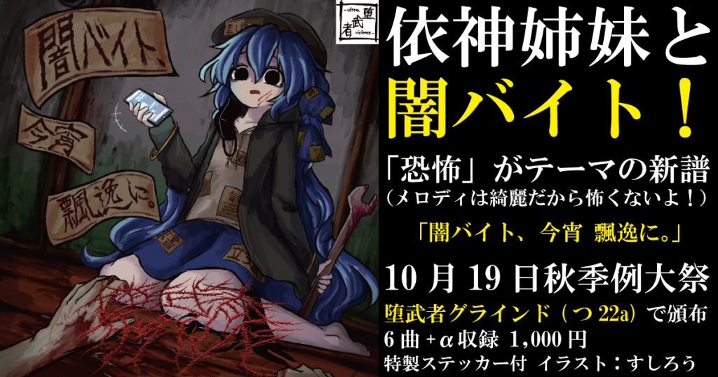 アートワークには、明るく可愛い中に恐怖が覗く、古明地こいしの秀逸なイラストを連日投稿されている「すしろう」様をお迎えしました。闇バイトで押し入った民家の廊下にへたり込み、絶望を湛えた表情の依神紫苑は、一度見たら忘れられないこと請け合いです。
