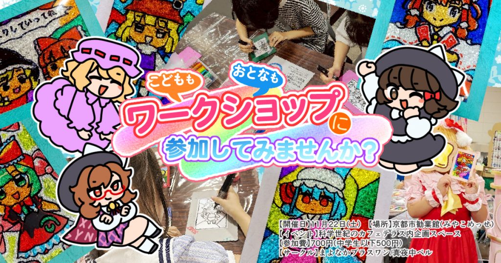 ※ワークショップという言葉に聞きなれない方もいらっしゃるかと思いますが、こちらは体験型講座を指す言葉です。今回は、東方名華祭でも開催した「東方キャラのキラキラカード」が作れるワークショップとなっております。