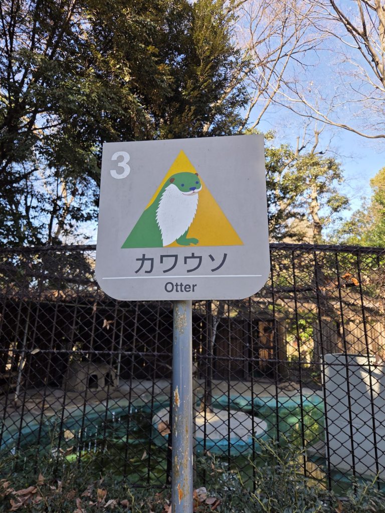 上野動物園のユーラシアカワウソ舎前の看板。なぜか緑色なのがジワジワきます。