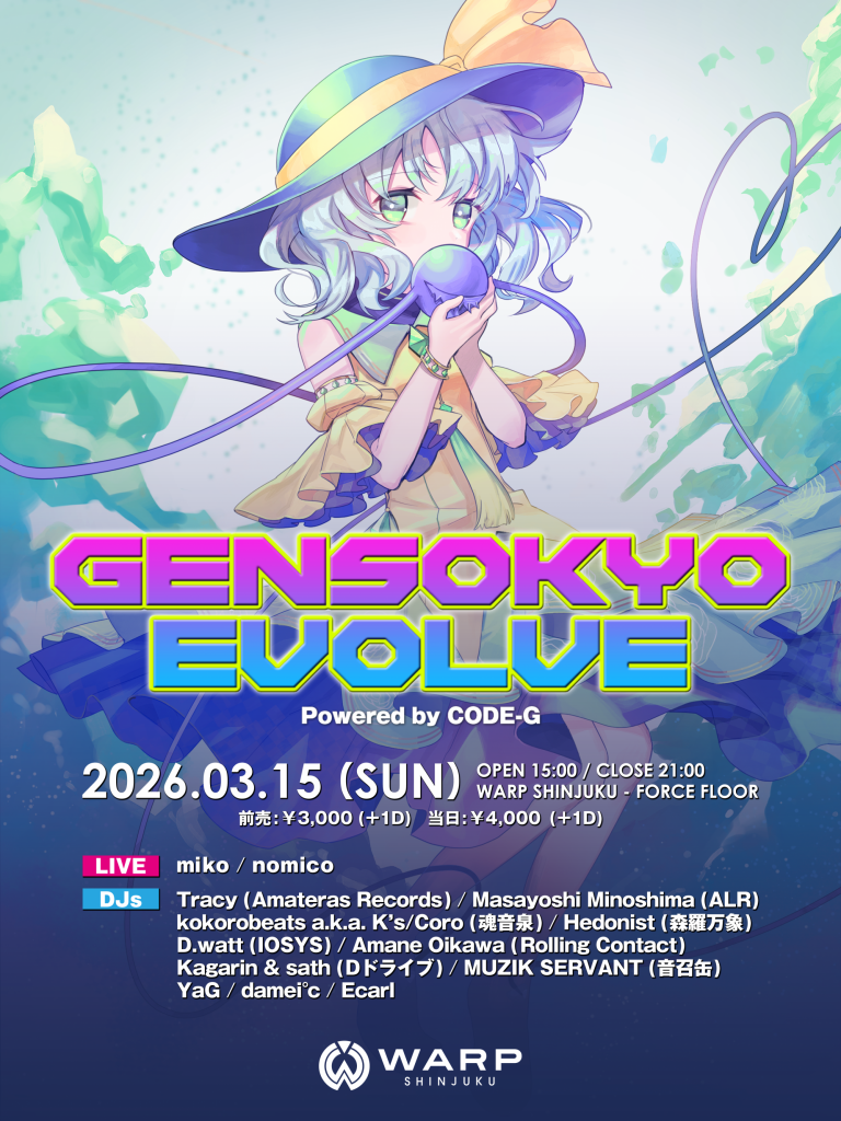 この度、新宿最大のナイトクラブ「WARP SHINJUKU」(FORCE FLOOR)にて、東方アレンジ音楽イベント「GENSOKYO EVOLVE Powered by CODE-G」を開催致します!