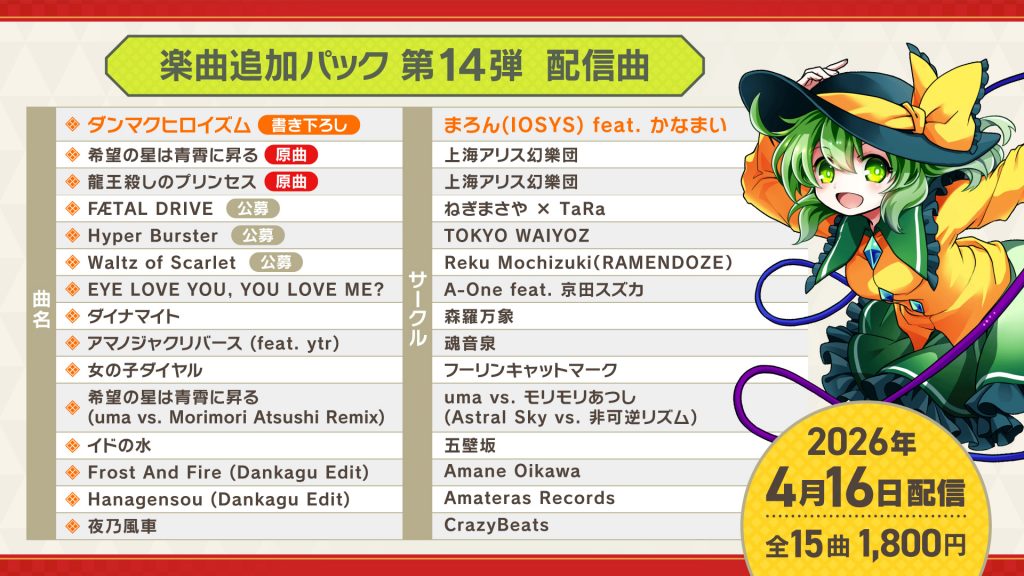 『東方ダンマクカグラ ファンタジア・ロスト』追加コンテンツ「楽曲追加パック 第14弾」が4月16日に配信開始!全15曲の試聴動画を公開。待望の原曲やまろん氏よる書き下ろし楽曲、コンテスト受賞曲を収録