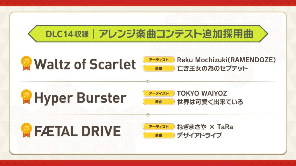 今回のDLCでは、東方Projectの原曲より、リズムゲームとして非常に要望の多かった以下の2曲を収録いたします。