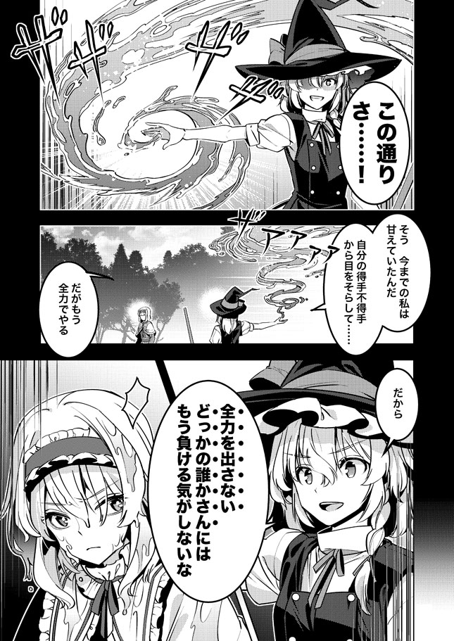 原作でも度々語られている魔理沙の水属性適正、そして本気を出さないアリスについての二次創作漫画です。自分なりのマリアリが描けたと思っています。