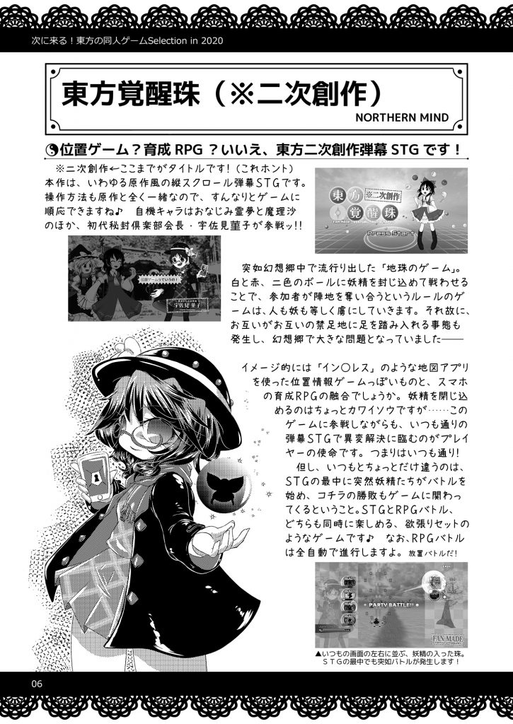 同人ゲームが好きすぎる筆者が「コレはきっと面白くなる!」と実際にプレイして感じた、東方二次創作ゲームの『体験版』を紹介する同人誌です(※3月調べ) 表紙・裏表紙は往年のゲーム雑誌風に仕上げてみました。
