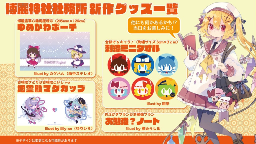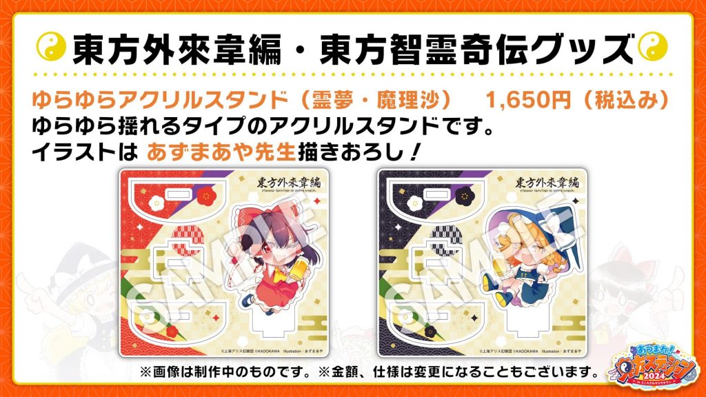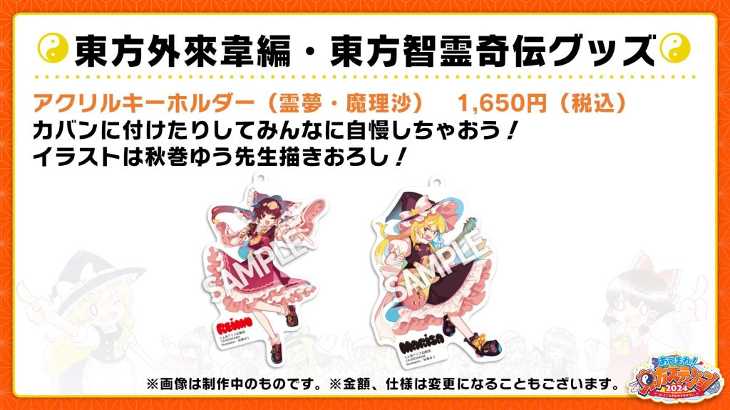 今年は「東方外來韋編 Strange Creators of Outer World. 」「東方智霊奇伝 反則探偵さとり 迷宮編」の表紙イラストや、あずまあや先生・秋巻ゆう先生の描き下ろしイラストを使ったグッズとなっています!