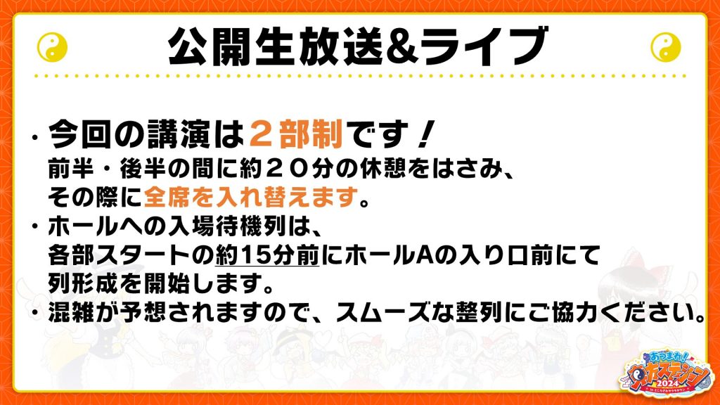 ・ホールへの入場待機列は、前半・後半スタートの約30分前にホールAの入り口前にて列形成を開始します。その時間までに、ホールA入口前に集合してください。