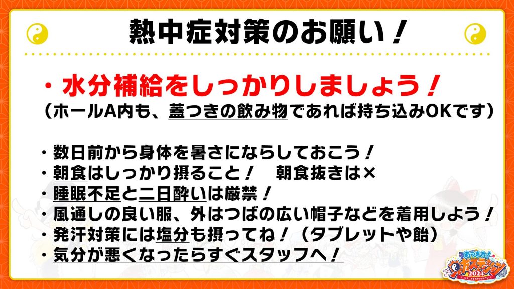 (ホールA内も、蓋つきの飲み物であれば持ち込みOKです)・数日前から身体を暑さにならしておこう!