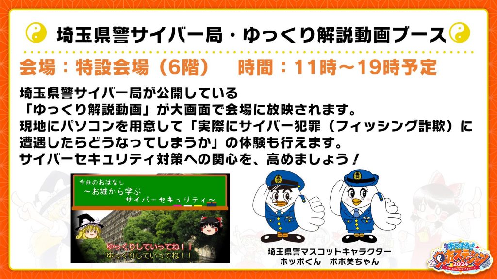 「あつまれ!東方ステーション 2024」と「埼玉県警サイバー局サイバー対策課」がコラボレーション!? 埼玉県警サイバー局が公開している「ゆっくり解説動画」が大画面で会場に放映されます。
