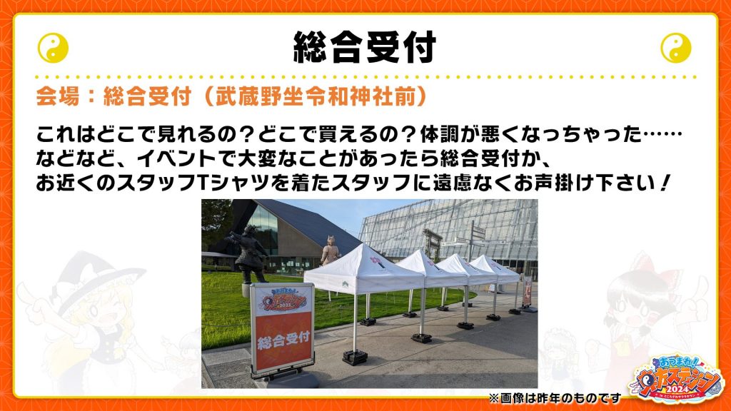 これはどこで見れるの? どこで買えるの? 体調が悪くなっちゃった……などなど、イベントで大変なことがあったらこちらの総合受付か、お近くのスタッフTシャツを着たスタッフに遠慮なくお声掛け下さい!