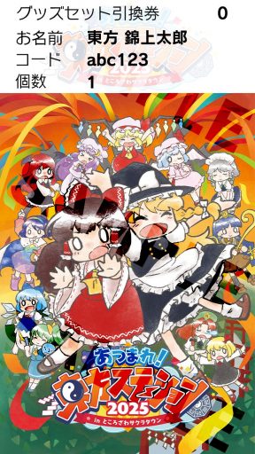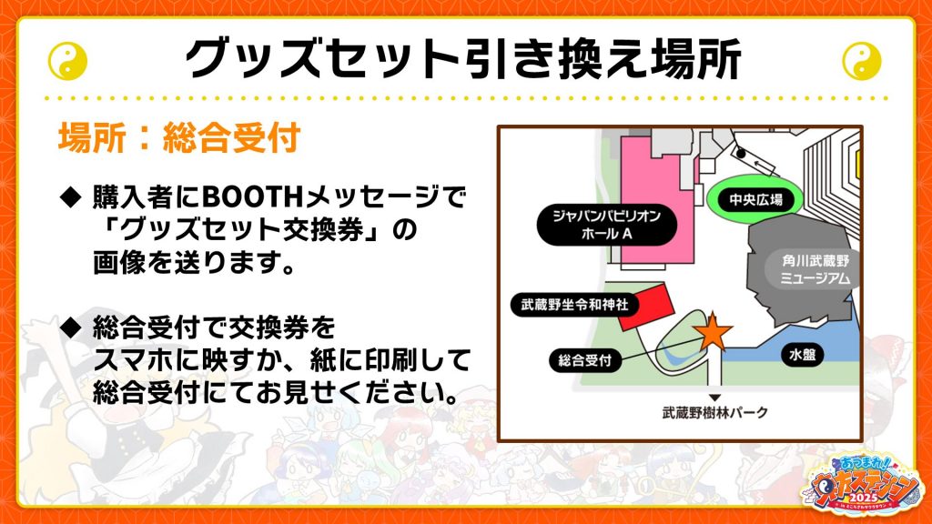 グッズセットの交換は神社横の【総合受付】にて行います。購入者にはBOOTHメッセージに「引き換え用画像」をお送りいたします。