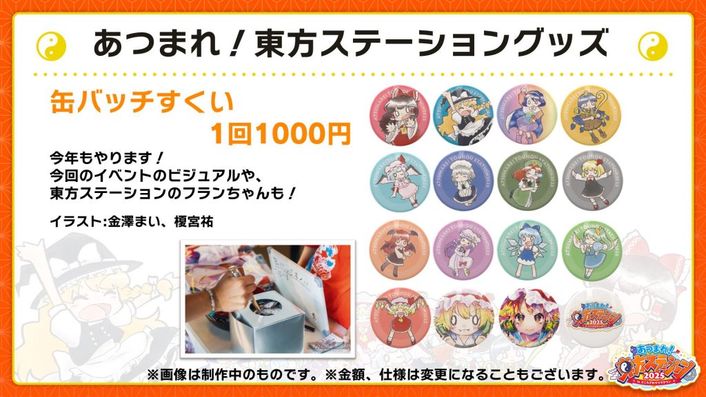 大人気の「缶バッジすくい」を、今年もやります! 2025のメインビジュアルや東方ステーションフランちゃんなど、全16種類の絵柄の缶バッジを制作しました。