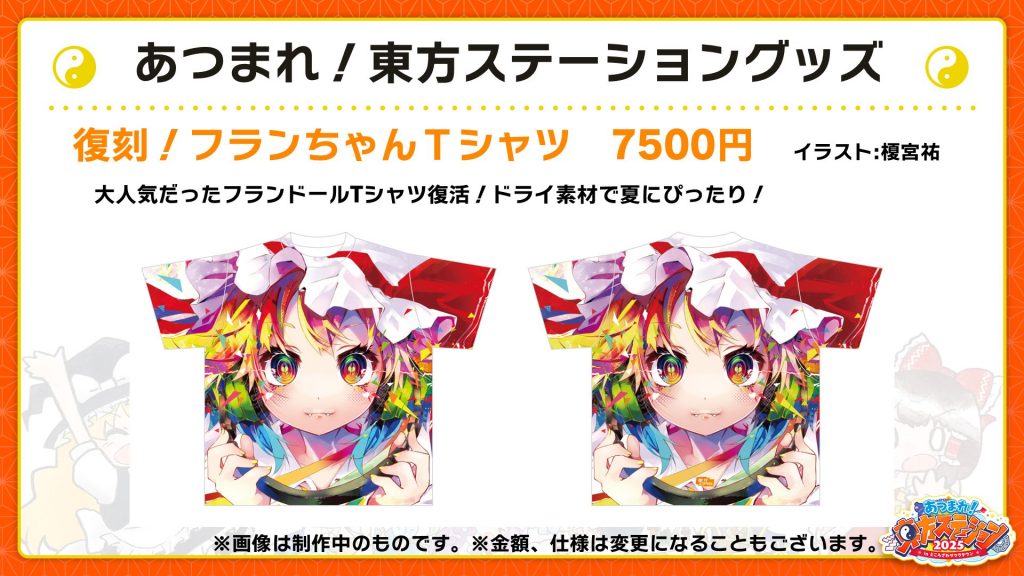 2023年に販売した東方ステーションフランちゃんTシャツを復刻!表も裏もフランちゃん、全身でフランちゃんが楽しめます。(物価高騰の影響で一昨年よりも値上がりしておりますが、ご了承ください)
