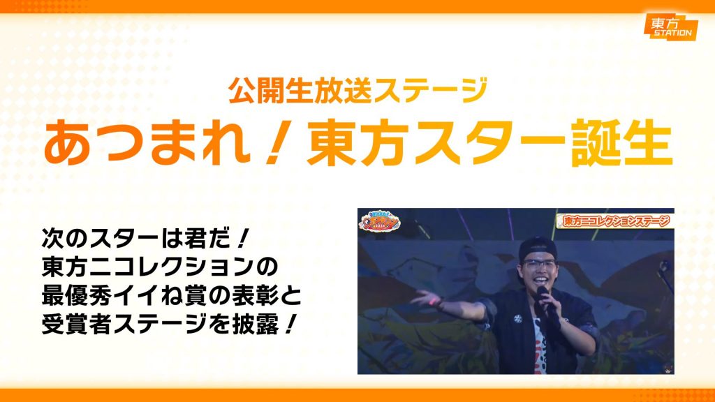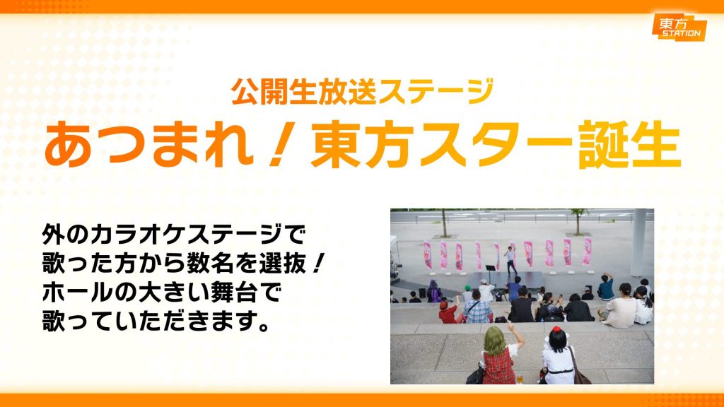 次の東方スターは君だ! 東方ニコレクションの最優秀イイね賞受賞者に、ステージでの歌唱を披露をしていただきます。さらに、毎年恒例カラオケステージから選ばれた方も参戦!