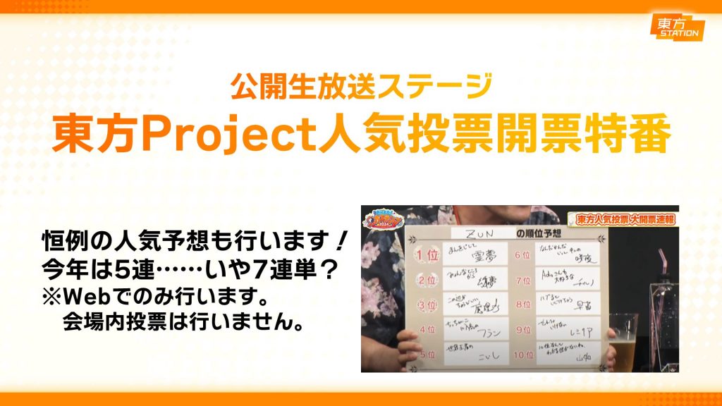 昨年に引き続き、今年も「東方Project人気投票」の開票をこの会場で行います。果たして今年は誰が1位になるのか……?