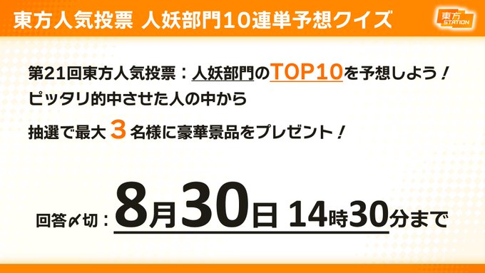 現在開催中の「第21回東方Project人気投票」の開票を公開生放送中に行います! 果たして今年の1位となるキャラクターは一体誰なのか……世紀の瞬間を一緒に体感しましょう!