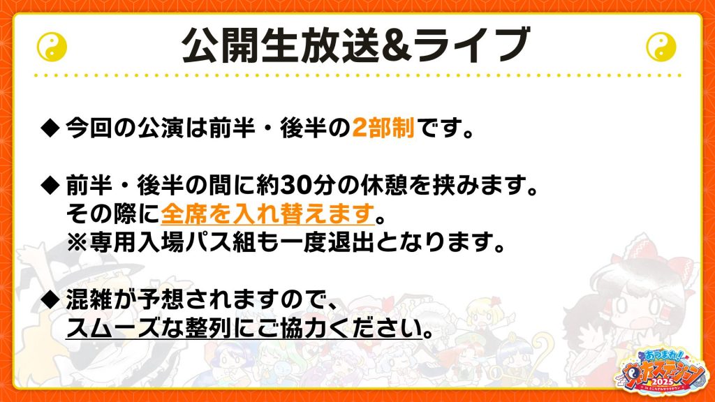 ・前半・後半の間に約30分の休憩をはさみ、その際に全席を入れ替えます。(専用入場パス組も一度退出となります)