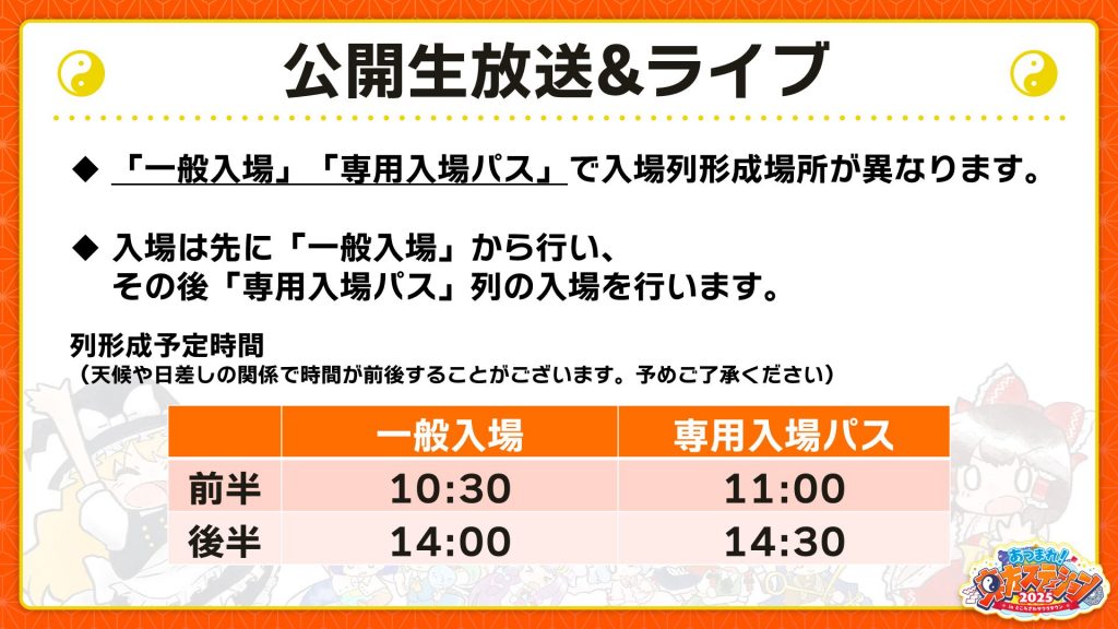 ・入場は先に「一般入場」列から行い、その後「専用入場パス」列の入場を行います。