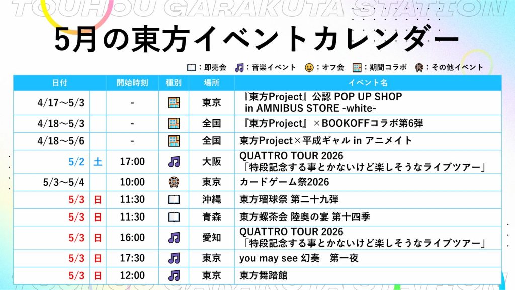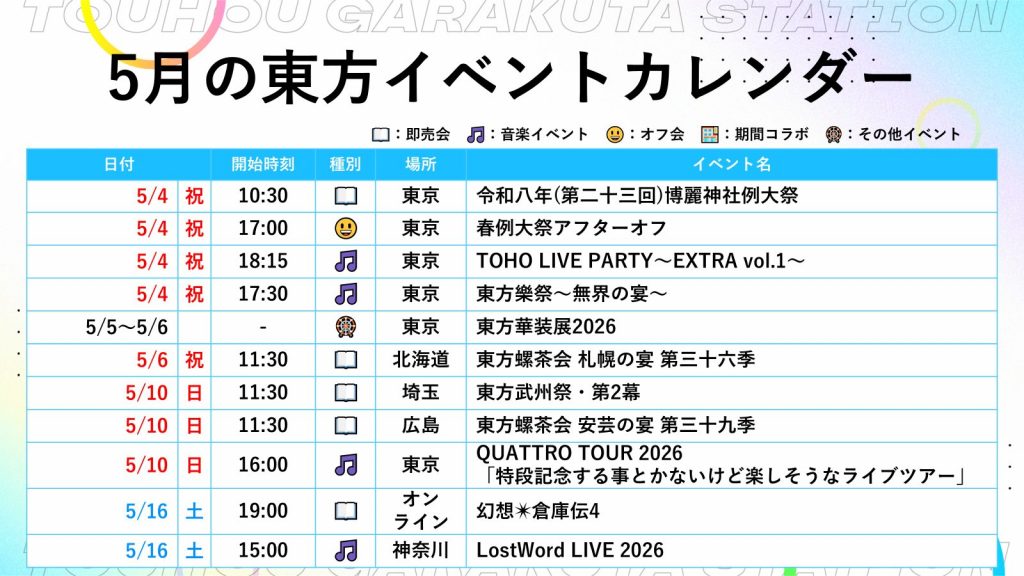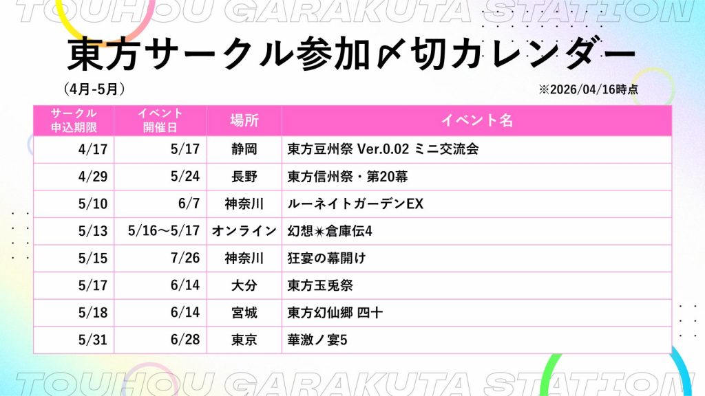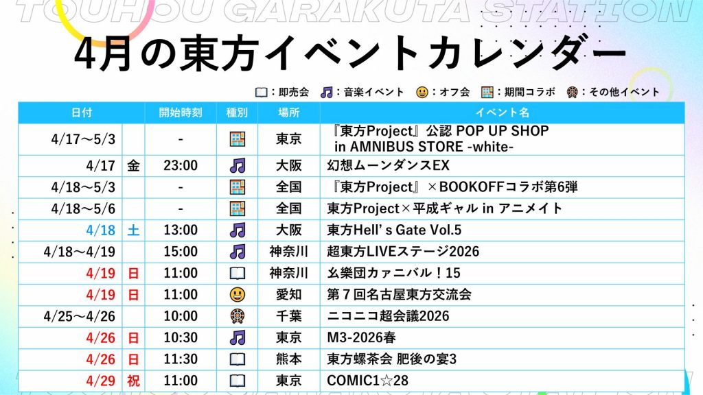 気になる東方イベント情報はここでチェック!東方イベントカレンダー 2026年4月号