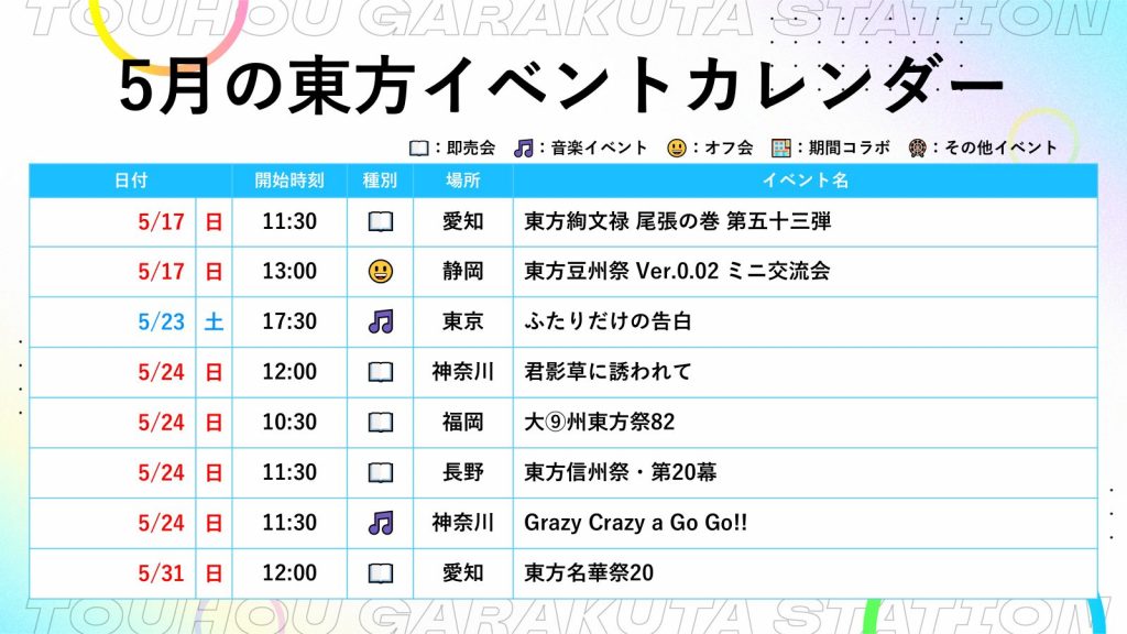 そんな貴方のために、東方我楽多叢誌では今後「東方イベントカレンダー」を定期的に公開してまいります。カレンダーの内容は、Discordサーバー「東方我楽多ステーション」でも公開中です。