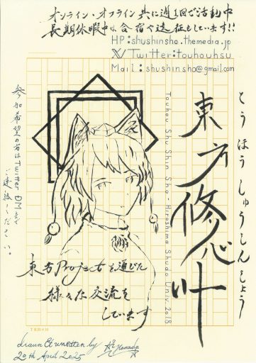 当サークルは岡山県以外の大学生さんも東方project初心者の方も大歓迎です。お気軽にご連絡を!皆で東方生活を楽しみましょう!代表者と連絡先:@voyage_3939