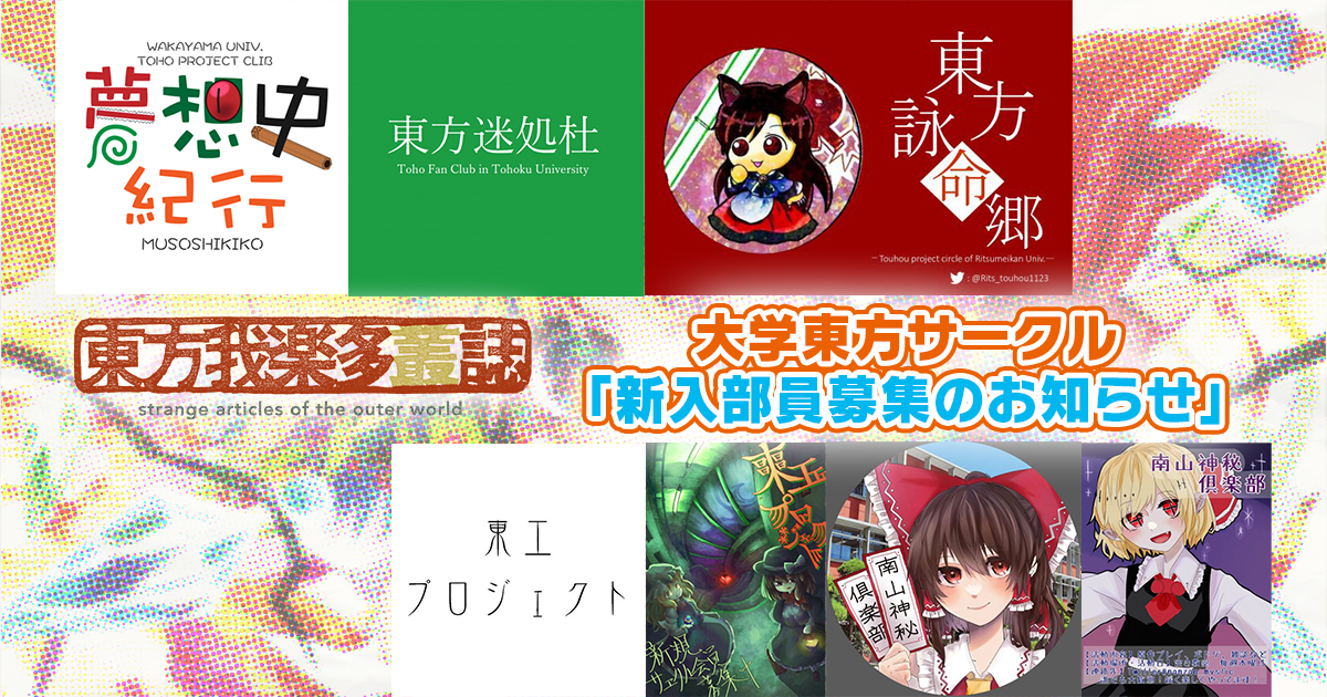 ご投稿いただいた大学東方サークルの皆さま、ありがとうございました! 東方我楽多叢誌では大学東方サークルの活動を応援しております。文化祭や課外活動など、大学内外の方に広めたい活動などがありましたら、ぜひ東方我楽多叢誌のお問い合わせにお送りください。毎週の東方ニュースにユーザープレスリリースとして取り上げさせていただきます!