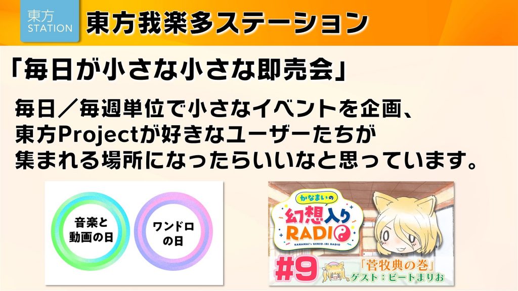 東方我楽多ステーションは東方ステーションや東方我楽多叢誌とも連動して、全国どこにいても東方を楽しめる場所を目指します。