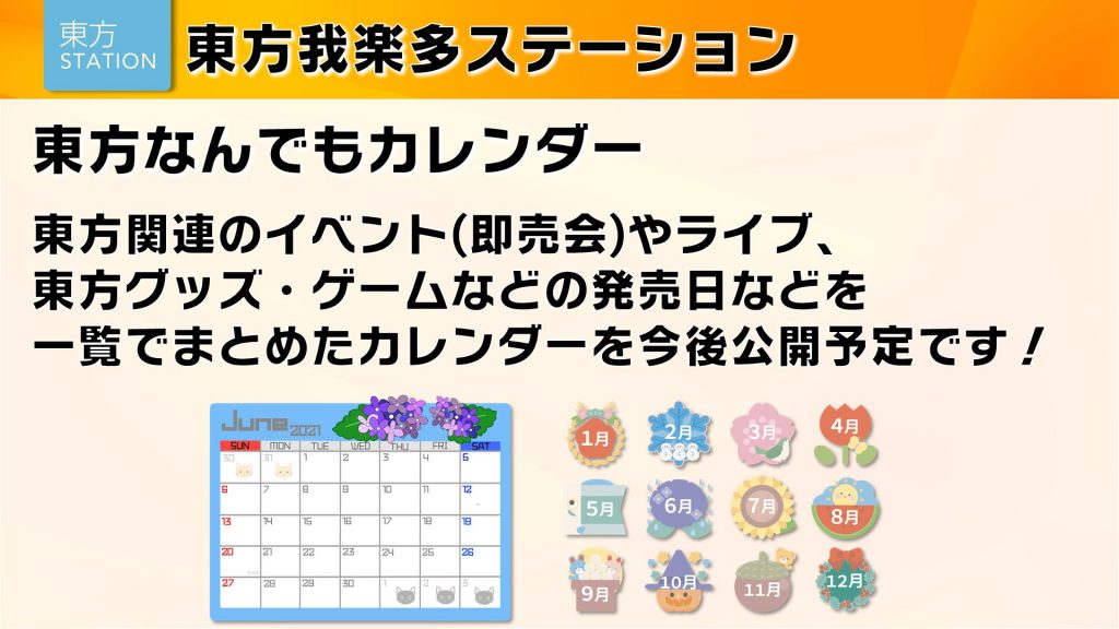 東方のイベント(即売会・ライブなど)の開催日や、東方グッズ、ゲームなどの発売日をまとめたGoogleカレンダーを東方我楽多ステーション内で公開予定です。