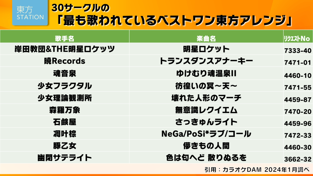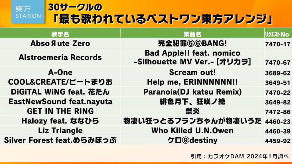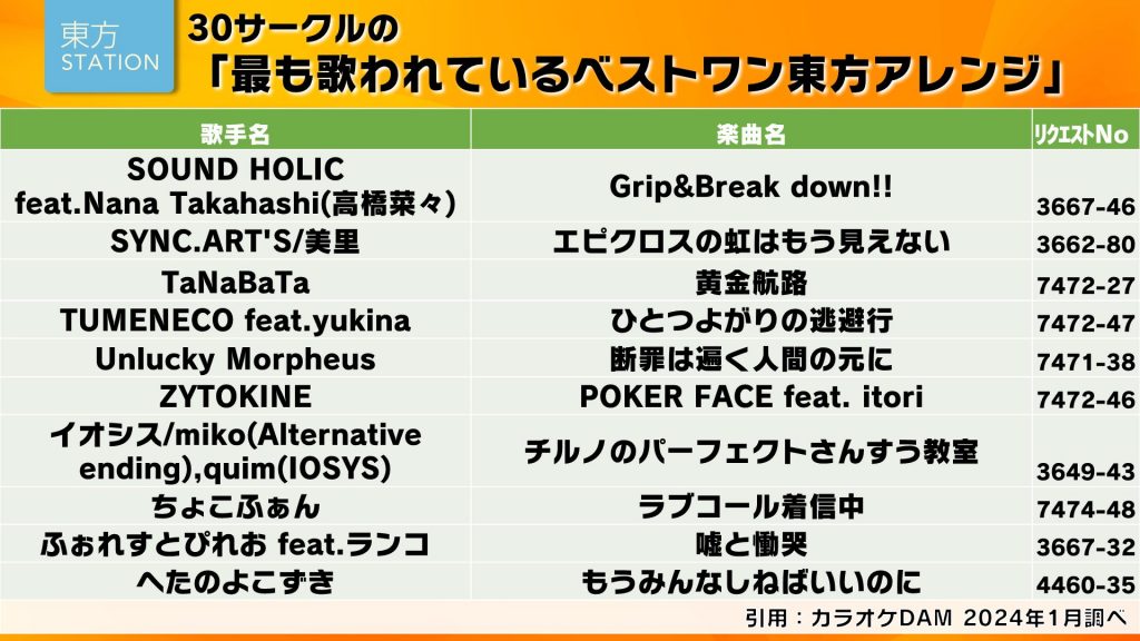 カラオケDAM・30サークルの「最も歌われているベストワン東方アレンジ」(2024年1月集計)