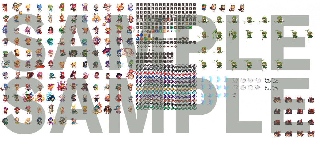 こちらのドットイラストは、『幻想郷萃夜祭』を制作しているお茶煮さんより東方ゲームジャムのために特別にご提供頂いた、「Win版以降の東方キャラ全員分」をまとめた素材集です。