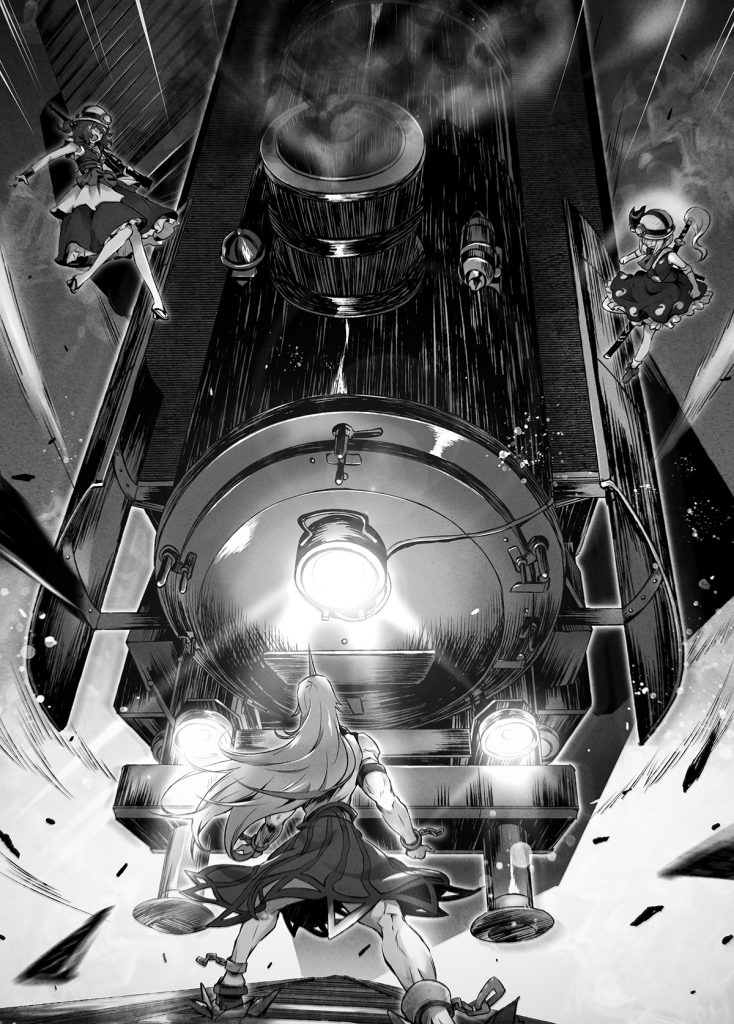 常識外の光景が巻き起こされる中、さらなる驚愕の光景が生じた。鉄の塊とも呼べる機関車が勇儀の動きに合わせて持ち上がり、彼女が上体を一気に逸らす中で後方へと投げ飛ばされたのだ。